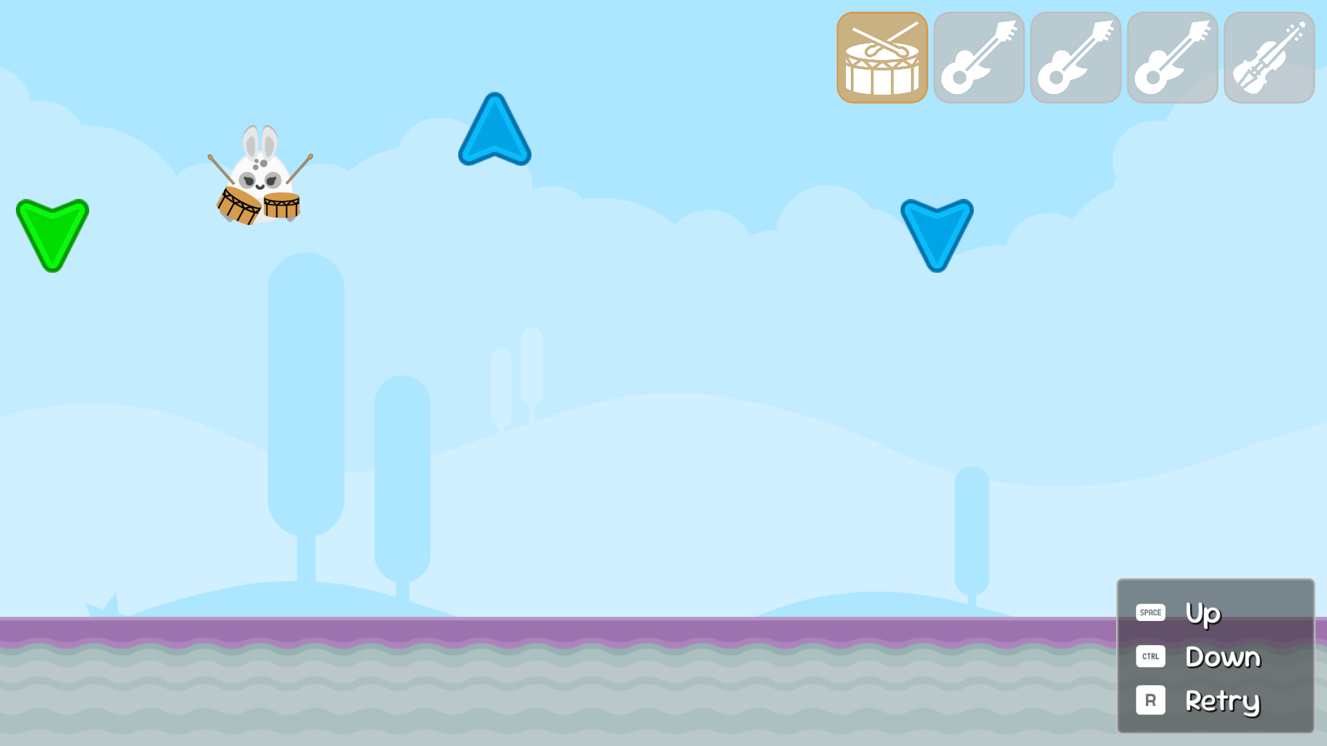 - Drums: Space / A / Right-side plays the "up" arrows (snare). Ctrl / D-pad-down / Left-side plays the "down" arrows (kick).
